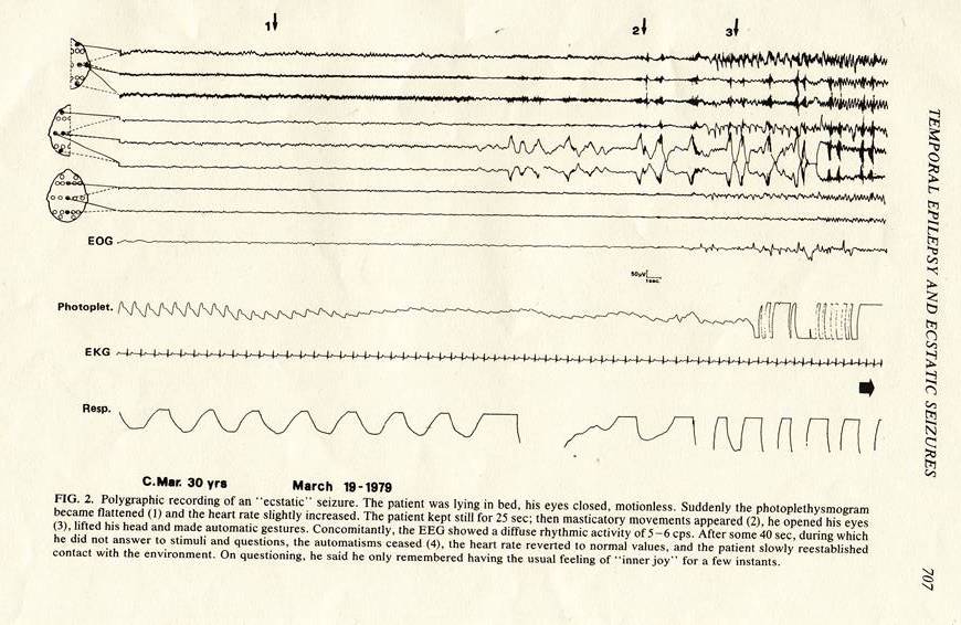 ポリグラフでエクスタシー発作を記録し、この発作が側頭葉てんかんであることを確認したはじめての報告である。