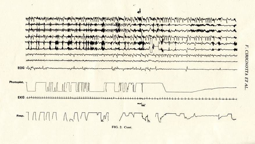 覚醒状態の脳波は正常であった。棘波の焦点が睡眠中の右側頭部に出現した。(Fig.1)。24時間のポリグラフの記録中に、精神運動発作が観察された。(Fig.2)。検査が終わってから、患者は、突然短いエクスタシーが起こったと話した。