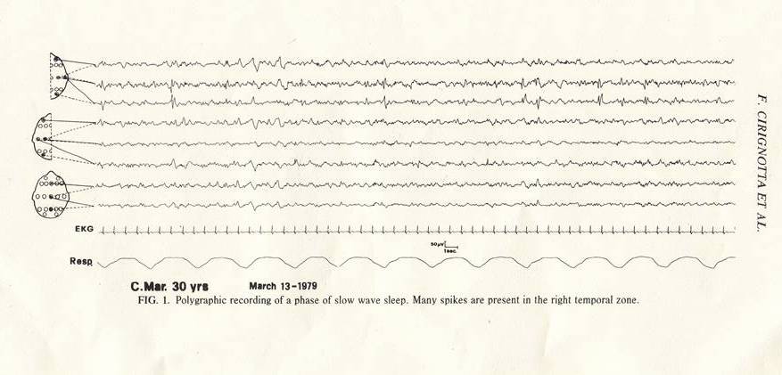 FIG.1 徐波睡眠の位相におけるポリグラフ記録。多くの棘波が右側頭部で存在する