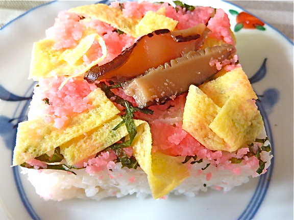 具はシンプルに岩国れんこん、干し椎茸、卵焼き、でんぶ、青紫蘇。